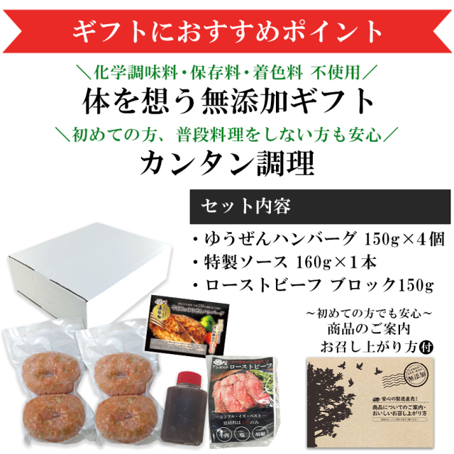 Topセット商品 【送料無料】肉 ギフト 贈り物 無添加 beef100%ギフトセット ゆうぜんハンバーグ 150g×4個 ハンバーグソース ローストビーフ 送料無料 ゆうぜんギフト メーカー希望小売価格: ¥3,980(税込) 価格: ¥3,980 (税込) [ポイント還元 199ポイント~] 販売期間: 納品書・請求書はギフトアイテムのため同梱しておりません: 選択してください 了承します 数量: セット 在庫: ○ 在庫あり 在庫 ○ 在庫あり 返品についての詳細はこちら レビューはありません [お肉の産地] 豪州・国産
