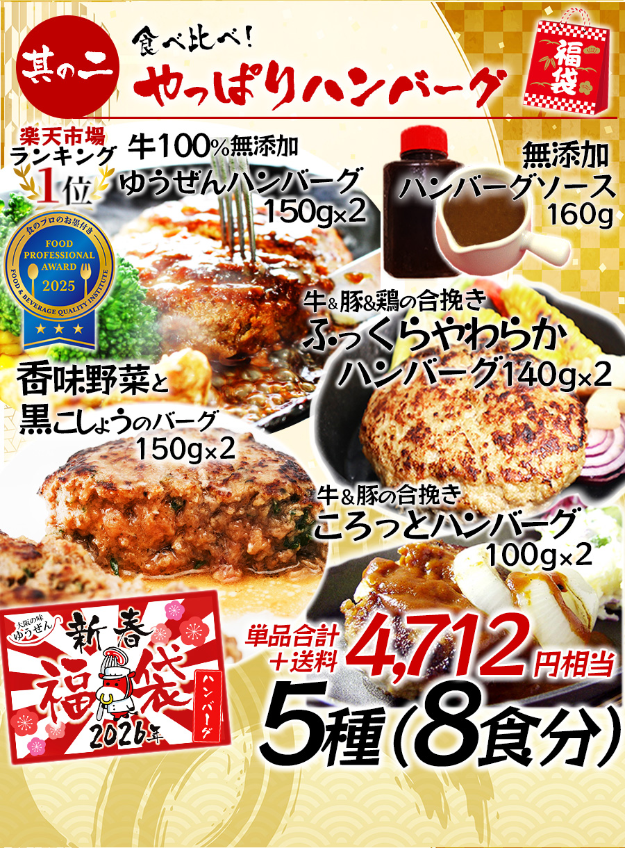 | ゆうぜんハンバーグ | 150g×2個 | 牛肉(豪州・国産)、玉ねぎ(国産)、全卵(国産)、パン粉、牛乳、醤油、食塩、胡椒 (一部に小麦・卵・乳成分・牛肉・大豆を含む) |